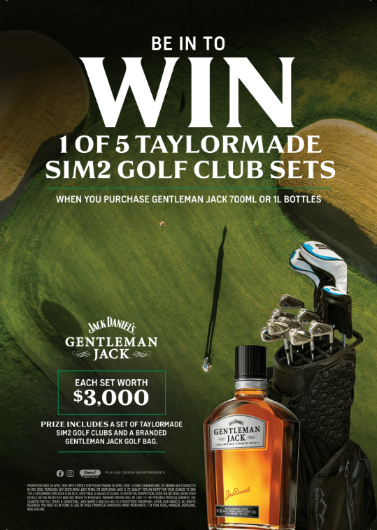 PROMOTION AND ENTRIES FOR PRIZING ENDS 31 MAY 2026 - ELIGIBLE WINNERS WILL BE DRAWN AND CONTACTED IN JUNE 2026. PURCHASE ANY GENTLEMAN JACK 700ML OR GENTLEMAN JACK 1L TO QUALIFY FOR AN ENTRY FOR YOUR CHANCE TO WIN 1 OF 5 TAYLORMADE SIM2 GOLF CLUB SETS. EACH PRIZE IS VALUED AT $3,000. TO ENTER THE COMPETITION, SCAN THE QR CODE, ENTER YOUR DETAILS ON THE MICRO-SITE AND ADD PROOF OF PURCHASE. WINNERS PRIZING WILL BE SENT TO THE PROVIDED PHYSICAL ADDRESS. SEE COUNTER FOR FULL TERMS & CONDITIONS. JACK DANIELS AND OLD NO.7 IS A REGISTERED TRADEMARK. 2026 JACK DANIELS. ALL RIGHTS RESERVED. YOU MUST BE 18 YEARS OF AGE OR OVER. PROMOTER: HANCOCKS FAMILY MERCHANTS, 1-78 TIDAL ROAD, MANGERE, AUCKLAND, NEW ZEALAND.